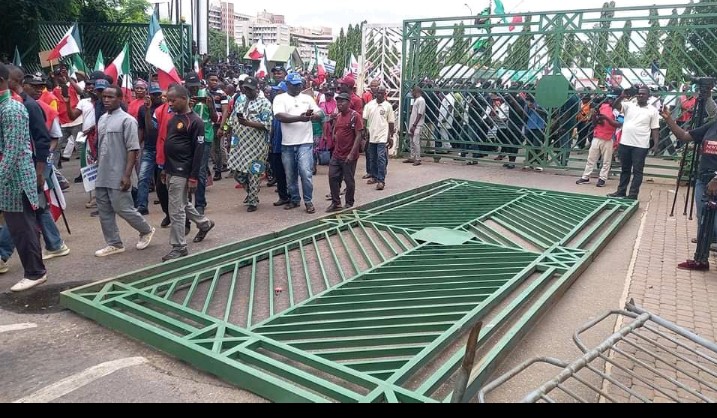 Members of the Nigeria Labour Congress (NLC) protesting the removal of fuel subsidy on Wednesday pulled down the gates of the National Assembly in Abuja.